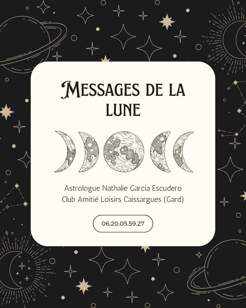 À partir du lundi 2 septembre 2024, rendez-vous les lundis des semaines paires pour les messages de la Lune à l’ancienne Mairie de Caissargues (proche de Nîmes dans le Gard, Occitanie, France) ! ![]()
