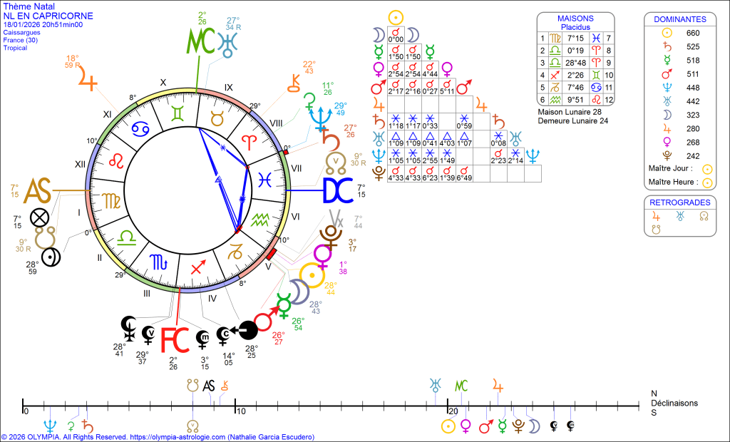 Le 18 janvier 2026, la Lune et le Soleil se retrouvent en Capricorne, ce signe du temps long, de la maturation, de la patience et des structures solides. Mais ils ne sont pas seuls. Autour dâeux, il y a Mars et Mercure Ă©galement en Capricorne :