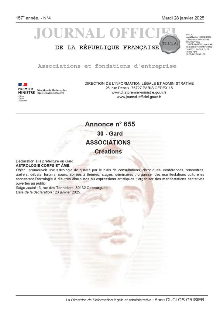 Objet : promouvoir une astrologie de qualité par le biais de consultations, chroniques, conférences, rencontres, ateliers, débats, forums, cours, soirées à thèmes, stages, séminaires ; organiser des manifestations culturelles connectant l’astrologie à d’autres disciplines ou expressions artistiques ; organiser des manifestations caritatives ouvertes au public